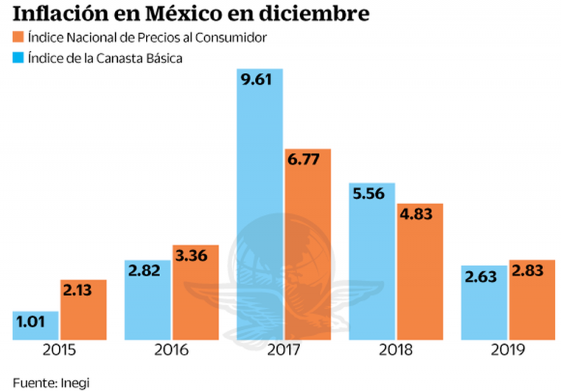Por su parte, la inflación general reportó un alza mensual de 0.56% en el último mes de 2019, con lo que el indicador anualizado se ubicó en 2.83%, que también fue el segundo menor desde 1969.