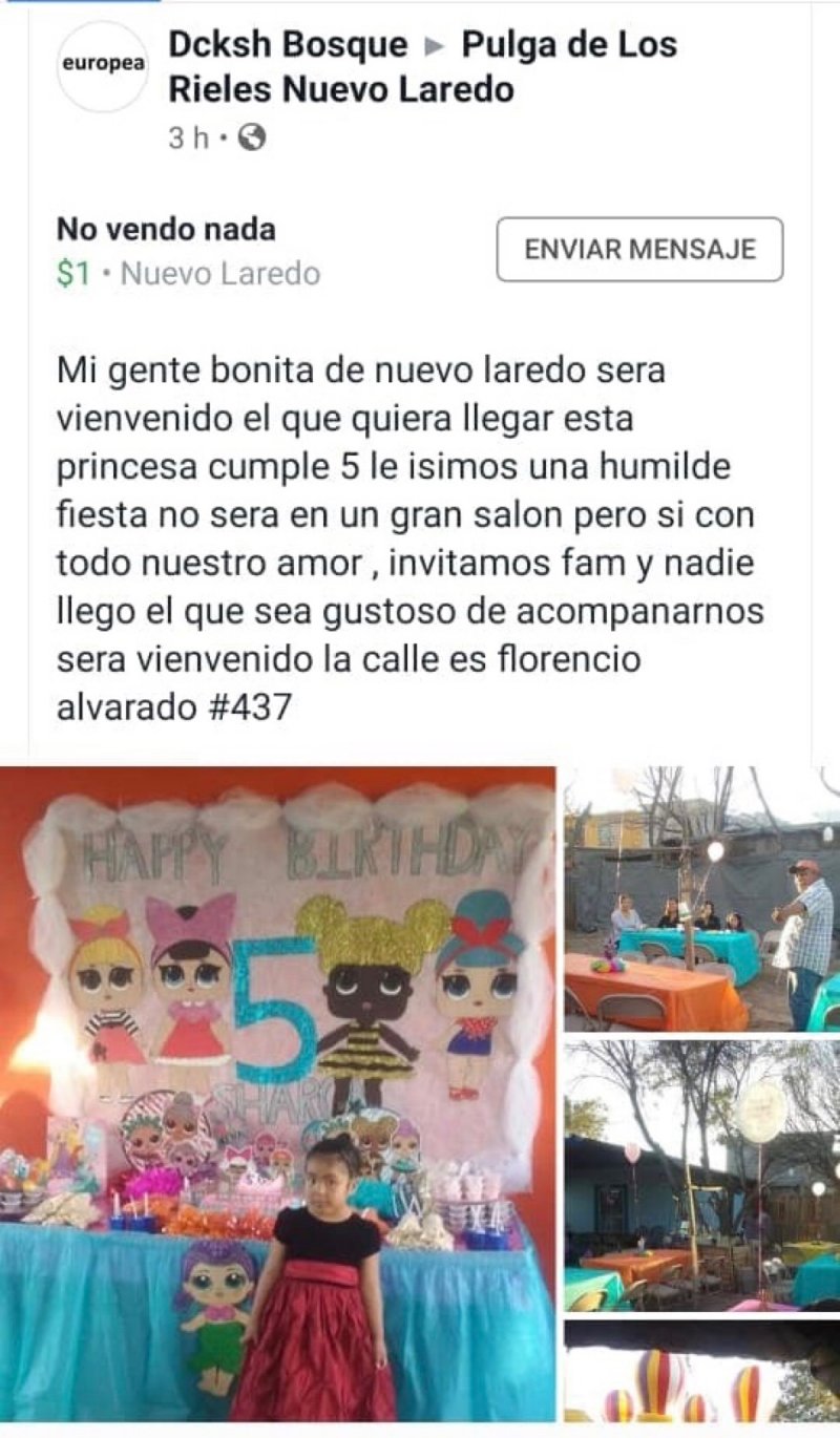“Mi gente bonita de nuevo laredo será bienvenido el que quiera llegar esta princesa cumple 5 le hicimos una humilde fiesta no será en un gran salón pero si con todo nuestro amor, invitamos fam y nadie llegó, el que sea gustoso de acompañarnos será bienvenido, la calle es florencio alvarado #37”, escribió la pareja en redes sociales.