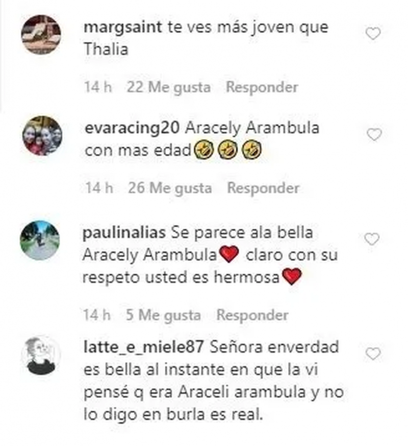 “Por un momento pensé que eras Aracely Arámbula. Te miras súper bonita y súper joven, pero siempre con ese toque de elegancia que siempre tienes. Bendiciones, Laura”, comentó una de sus fans.