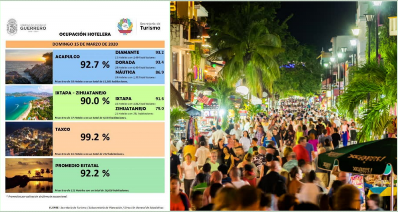 La Secretaría de Turismo de Acapulco, Guerrero, informó que la ocupación hotelera en la costa superó el 90 % durante este fin de semana de puente largo con este 16 de marzo, día de asueto oficial, a pesar de que se confirmó el primer caso de coronavirus en esta entidad.