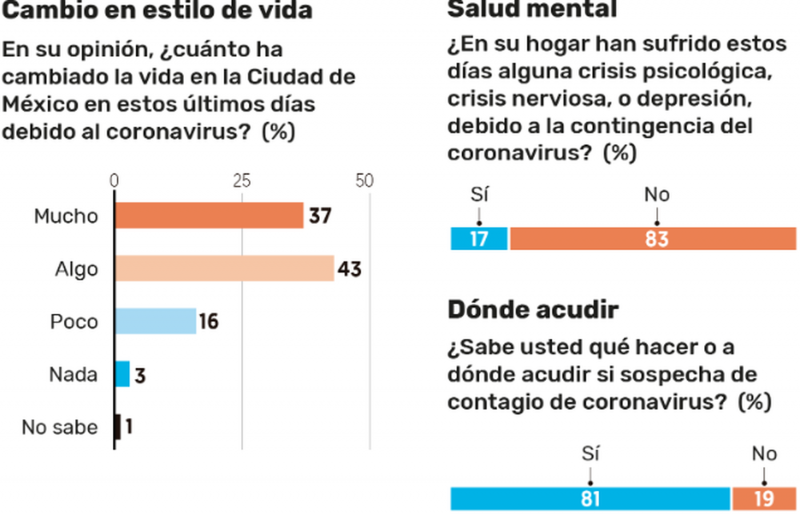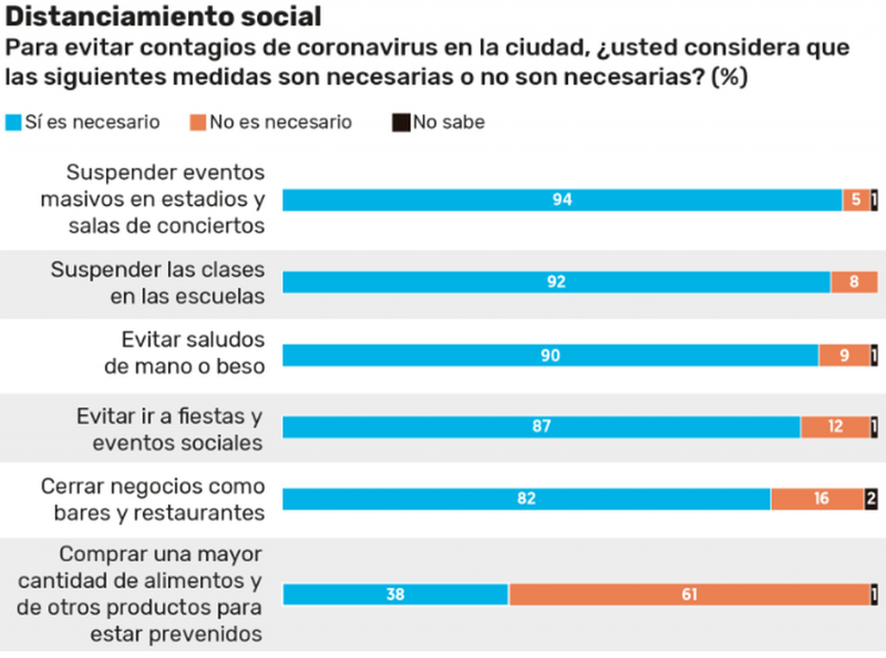 De acuerdo con una encuesta de El Financiero, realizada por vía telefónica en la capital del país a 400 adultos, el 94 por ciento de los consultados cree que, para evitar contagios del coronavirus en la ciudad, sí es necesaria la suspensión de eventos masivos en estadios y salas de conciertos; el 92 por ciento apoya la suspensión de clases; el 90 por ciento cree necesario evitar los saludos de mano o beso.