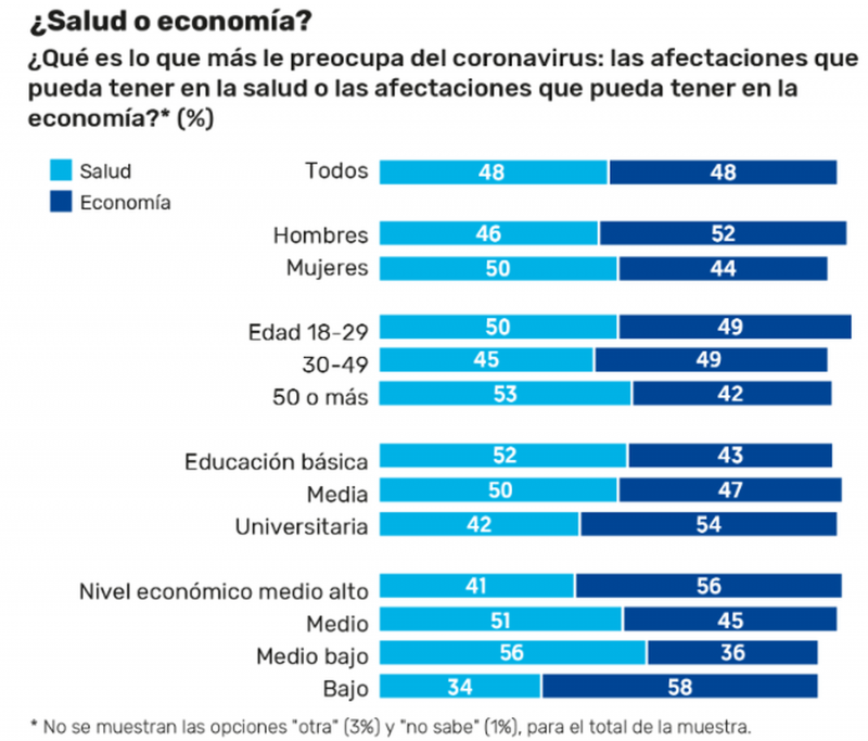 Según el estudio, el 48 por ciento cree que el coronavirus afectará principalmente a la salud, mientras que otro 48 por ciento cree que el principal golpe de la pandemia se dará en el plano económico.