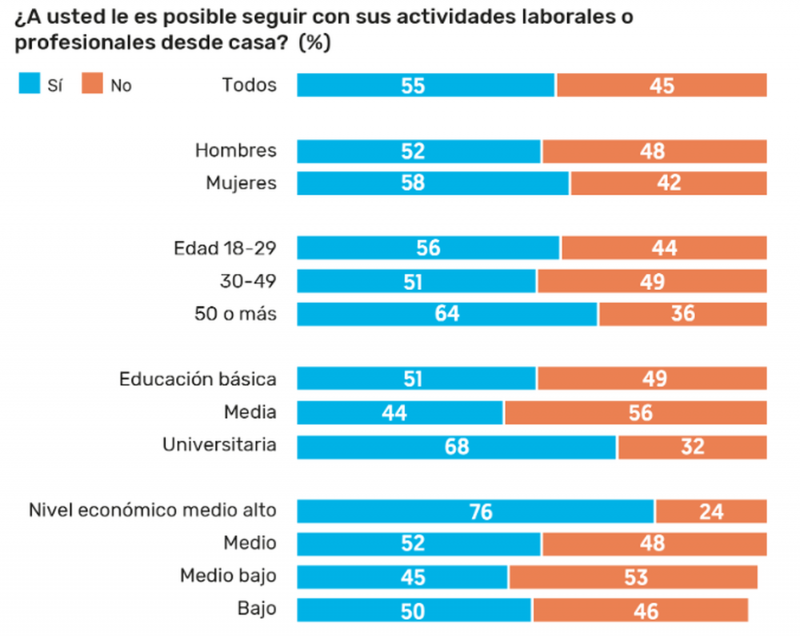 Según el sondeo, al 55 por ciento sí le es posible continuar con sus labores desde casa, mientras que el 45 por ciento dijo que eso no les es posible.