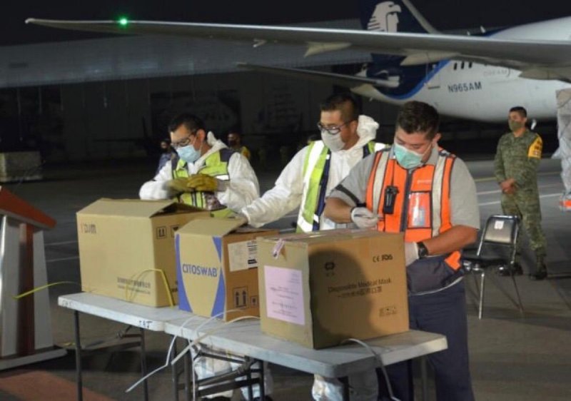Entre los insumos que la aeronave transporta se encuentran: 48 ventiladores, 13 mil 800 goggles; 40 mil kits para transporte de muestras; 499 mil 800 máscaras protectoras; 206 mil cubrebocas, que equivale a 99.2 metros cúbicos de equipo conforme a los previsto.