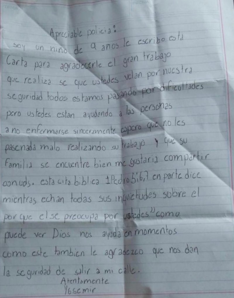 Soy un niño de 9 años, le escribo esta carta para agradecerle el gran trabajo que realiza, se que ustedes velan por nuestra seguridad, todos estamos posando dificultades, pero ustedes están ayudando a las personas a no enfermarse, sinceramente espero que no les pase nada malo realizando su trabajo y que su familia se encuentre bien me gustaría compartir con ustedes esta cita bíblica Pedro5;6,7 en parte dice mientras echan todas sus inquietudes sobre el porque el se preocupa por ustedes, como puede ver Dios nos ayuda en momento como este. También le agradezco nos dan la seguridad de salir a mi calle”
