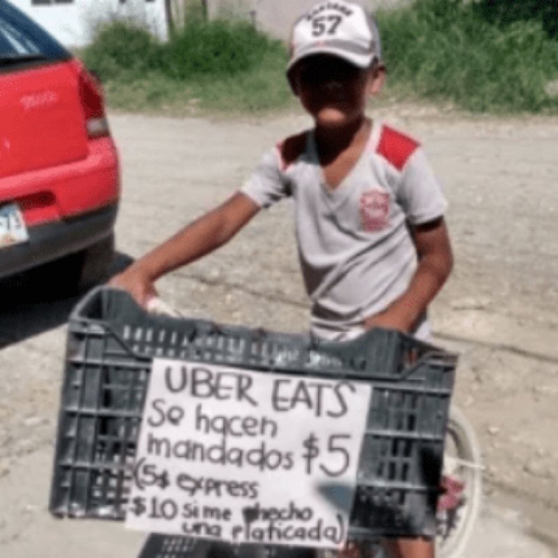 Para que aumentara sus ventas, a su vecina Leslie de los Reyes se le ocurrió ponerle al frente de la bicicleta del niño un anuncio con el siguiente mensaje: “UBER EATS. Se hacen mandados $5 ($5 express $10 si me hecho una platicada)”