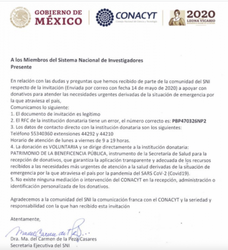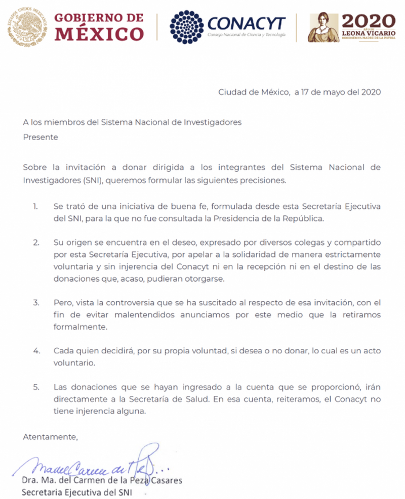 Anteriormente, una primera carta ya invitaba a los miembros del SNI a donar voluntariamente uno, dos o tres meses del estímulo que recibían, en apoyo al sistema de salud durante el combate por la pandemia actual.