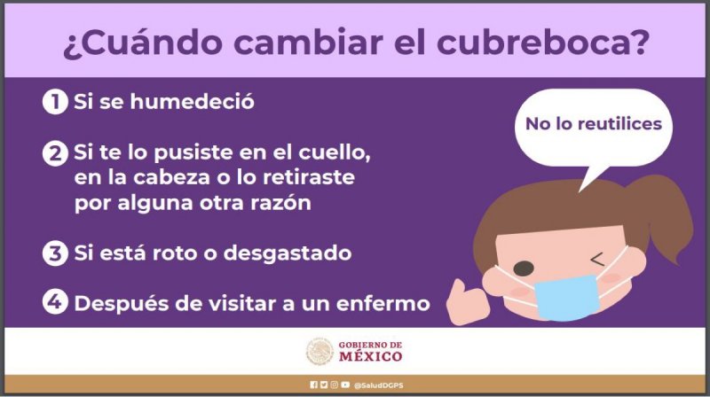 La Secretaria de Salud, también señala que el cubrebocas se debe cambiar cuando esté húmedo, si te lo quitaste o si lo usaste como collar o diadema.