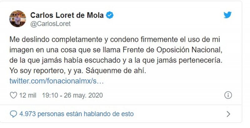 “Me deslindo completamente y condeno firmemente el uso de mi imagen en una cosa que se llama Frente de Oposición Nacional, de la que jamás había escuchado y a la que jamás pertenecería. Yo soy reportero”, escribió en su cuenta de Twitter.