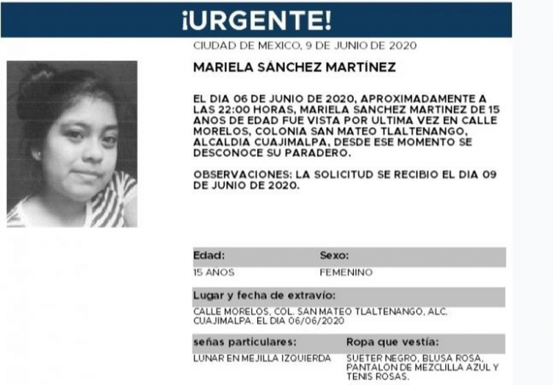De acuerdo con la Alerta Amber emitida por la Fiscalía General de Justicia (FGJ) de la Ciudad de México, Mariela Sánchez Martínez fue vista por última vez en Calle Morelos de la colonia San Mateo Tlaltenango, en la alcaldía Cuajimalpa, el pasado 06 de junio aproximadamente a las 22:00 horas.