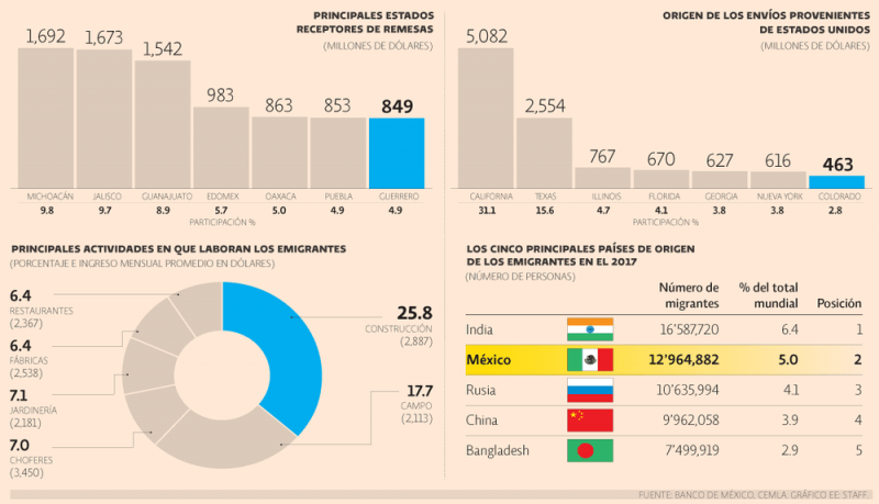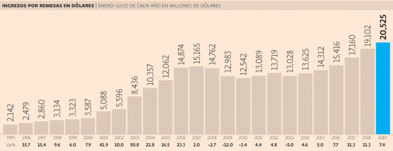 México se ubica en el tercer lugar a escala mundial de países que más reciben remesas, solo por detrás de India y China. El presidente López Obrador informó que en marzo se recibieron cuatro mil millones de dólares, esto equivaldría a 40 mil millones de dólares al año “puede ser el presupuesto de un país”.