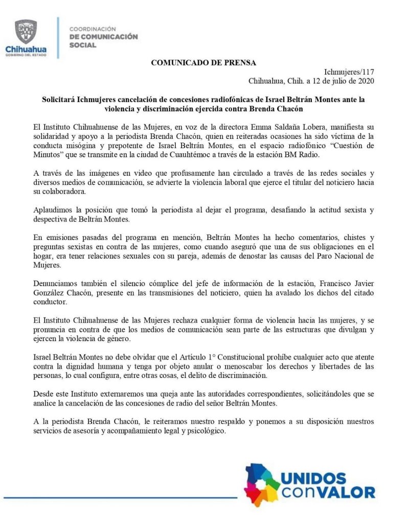 El Instituto mostró su respaldo y ofrece asesoría y acompañamiento legal a Brenda Chacón. Agregaron que interpondrán una queja contra Beltrán Montes para analizar la “cancelación de las concesiones” de radio del expresidente municipal.