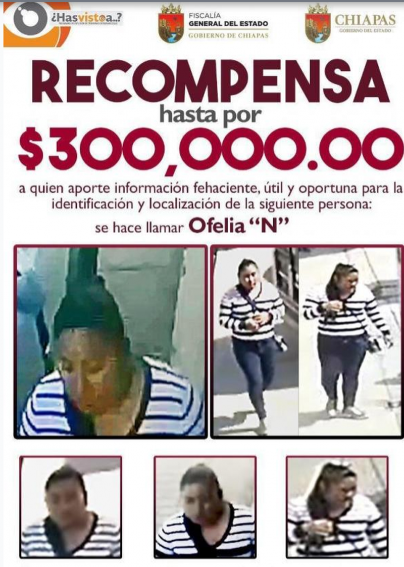 Mexicali, Baja California. La Fiscalía General de Justicia del Estado de Chiapas, ofreció dos recompensas por un monto de hasta 600 mil pesos a quien aporte información que lleve a la localización del menor Dylan Esaú, desaparecido desde hace tres semanas en el mercado de San Cristóbal de las casas, y por Ofelia “N”, quien presuntamente participó de manera directa en la desaparición del menor