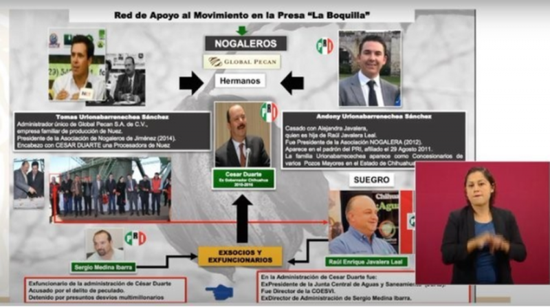 De manera especial se citó a la familia (Urionabarrenechea) ligada – aseguró- al ex gobernador César Duarte. El suegro de uno de ellos, dijo, fue el presidente de la junta de aguas y saneamiento de Chihuahua, grupo que estuvo atrás del financiamiento, en gran medida, de la movilización en La Boquilla.