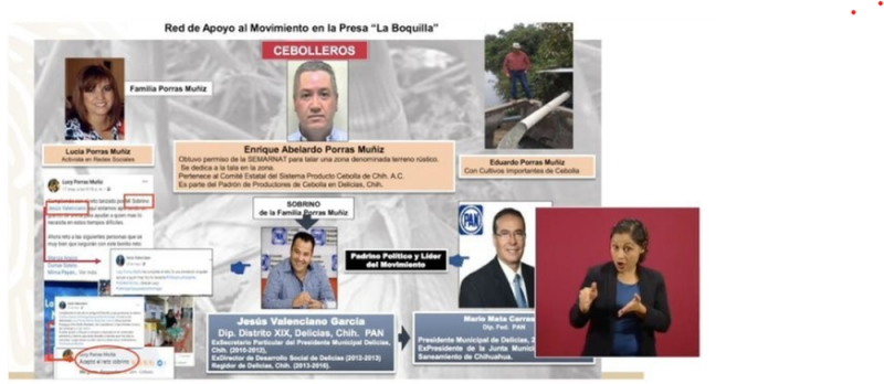 También mencionó al grupo de productores de cebolla ligada, mencionó, al diputado local por Delicias, Chihuahua, Jesús Valenciano, “quien increpó a la Guardia Nacional, les dio un ultimátum para que se fueran y les dijo que si no se iban les iba a pasar lo mismo que había pasado en La Boquilla”. El diputado es pariente de una familia dedicada a la sobre explotación, agrego el subsecretario.