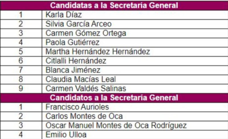 Las mujeres pasaron en automático a la encuesta final, por el principio de paridad de género, por lo que no participaron en esta primera etapa. Conforme a este principio, si una mujer gana la presidencia, un hombre asumirá la secretaría general, y viceversa.