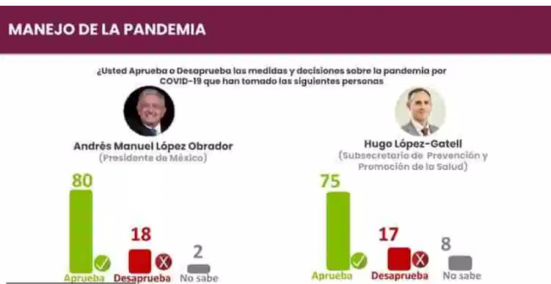 No obstante, pese a esa situación, los encuestados respaldan de manera contundente el trabajo de AMLO y López-Gatell para contener la pandemia, con una aprobación de 80 y 75 por ciento respectivamente.