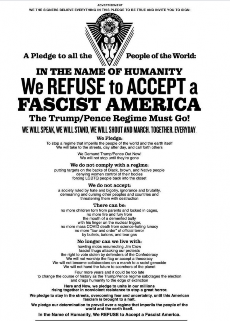 “Esta es la importancia de que millones presten atención al mensaje de este compromiso. Robar unas elecciones llega al núcleo de una toma de poder fascista y nos negamos a vivir en un Estados Unidos fascista”, desplegado firmado por famosos