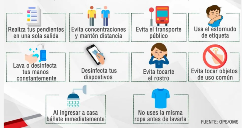 Asimismo, en la medida de lo posible evitar el transporte público, utilizar el estornudo de etiqueta para reducir contagios, lavar constantemente con agua y jabón las manos, desinfectar los dispositivos móviles que utilicen.