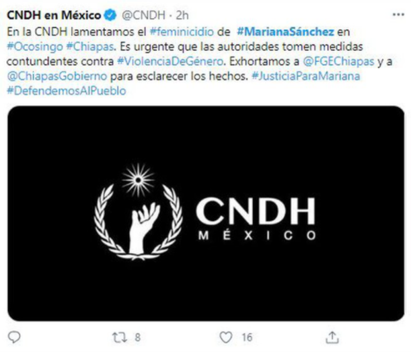 “En la CNDH lamentamos el #feminicidio de #MarianaSánchez en #Ocosingo #Chiapas. Es urgente que las autoridades tomen medidas contundentes contra #ViolenciaDeGénero. Exhortamos a @FGEChiapas y a @ChiapasGobierno para esclarecer los hechos. #JusticiaParaMariana #DefendemosAlPueblo [sic]”, dijo la Comisión.
