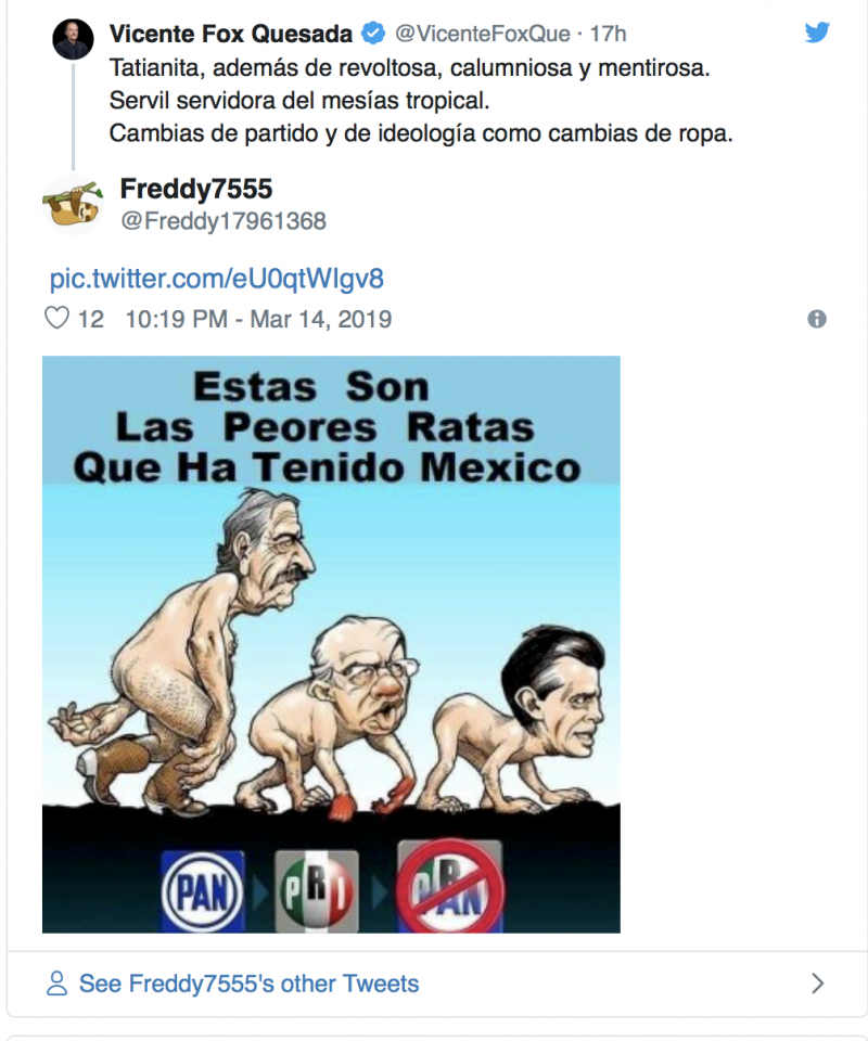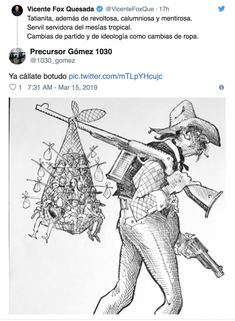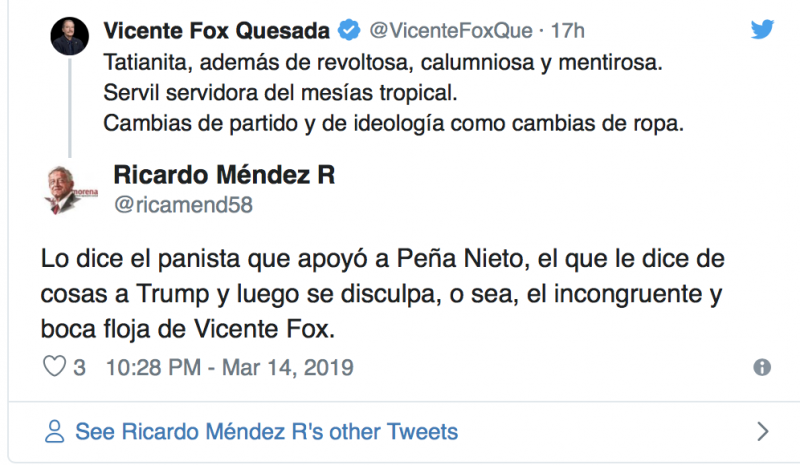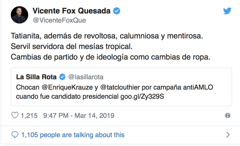 Esta vez el guanajuatense arremetió contra la Vicecoordinadora de Morena en San Lázaro, Tatiana Clouthier, acusandola de ser servil a AMLO al cual llama “Mesías Tropical”. algo irónico pues el panista se la pasa pidiendo respeto hacia él mismo.