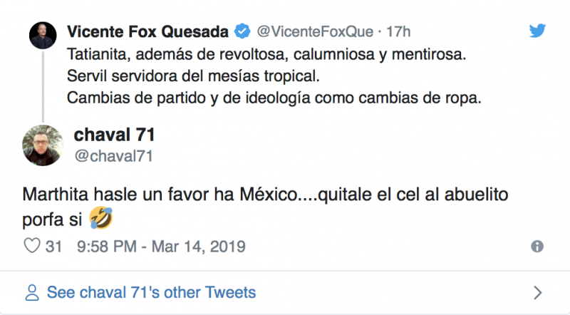Marta Sahagún es recurrente en este tipo de tuits, pues usuarios e ruegan, le quite el celular a su esposo, o por lo menos no se lo dé antes de que tome sus medicamentos.