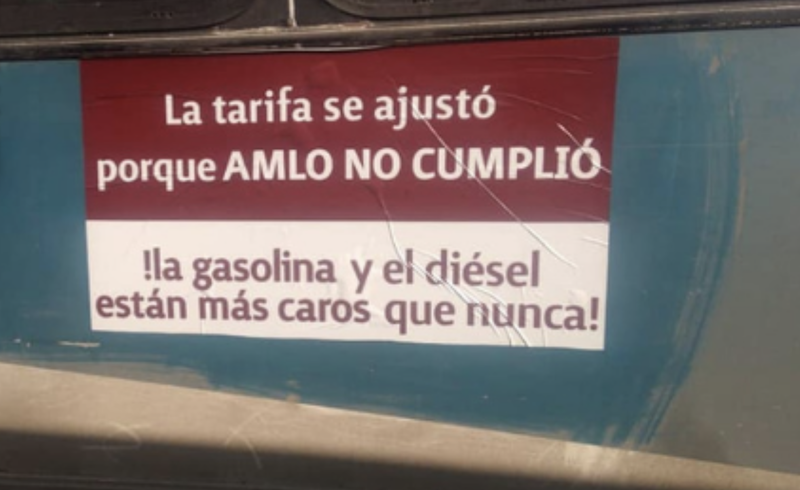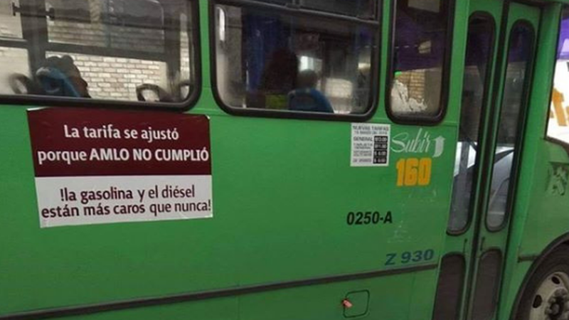 Una campaña contra el presidente Andrés Manuel López Obrador recorre las calles de Saltillo debido a que en los autobuses del transporte urbano fueron colacadas unas calcomanías que indican que ‘la tarifa se ajustó porque AMLO no cumplió’ sus promesas sobre el costo del combustible.
