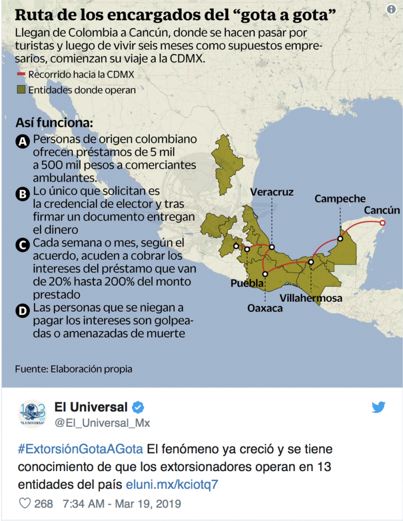 “Sin estigmatizar, pero importaron un modelo que fue creado en Colombia, en Bogotá, en Medellín, el ´gota a gota´; algunos colombianos empezaron a traer ese sistema de actuación aprovechando la necesidad de liquidez de la gente”, explicó el secretario de Seguridad Ciudadana, Jesús Orta Martínez.