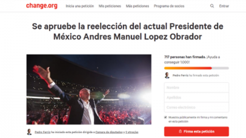 Un grupo de simpatizantes del Presidente Andrés Manuel López Obrador, inició en la plataforma change.org, una petición para exigirle a los legisladores mexicanos que consideren la reelección de AMLO en los comicios de 2024.