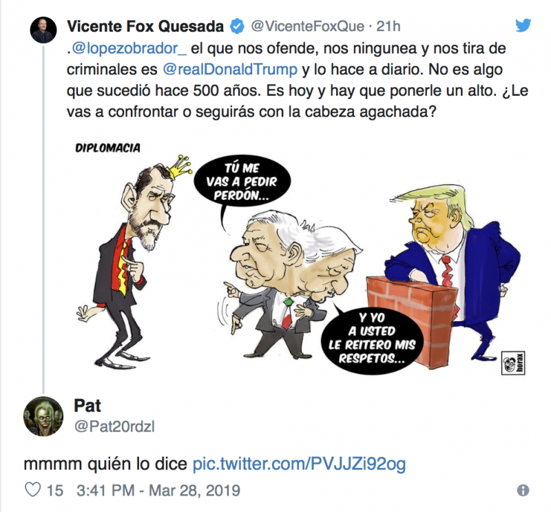 Para no perder la costumbre, en esta ocasión el guanajuatense, a través de su trinchera cibernética, llamada Twitter, dijo que AMLO debería exigirle respeto a Donald Trump, presidente de Estados Unidos, y no a la Corona española.