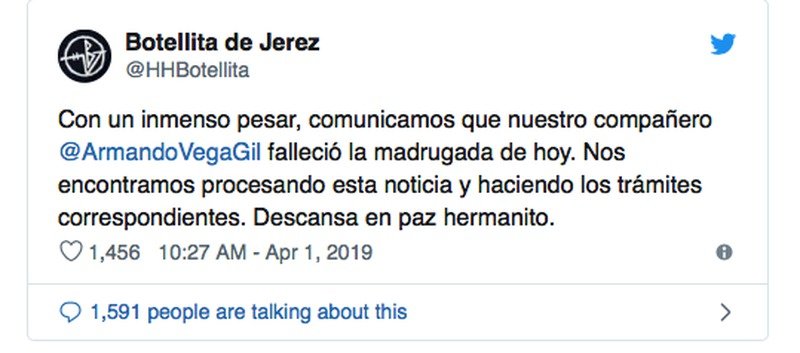 "Con un inmenso pesar, comunicamos que nuestro compañero Armando Vega Gil falleció la madrugada de hoy. Nos encontramos procesando esta noticia y haciendo los trámites correspondientes. Descansa en paz hermanito", se lee en el tuit.