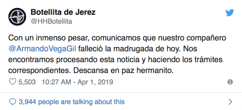 Botellita de Jerez, agrupación que fundó confirmó su pérdida a través de Twitter.