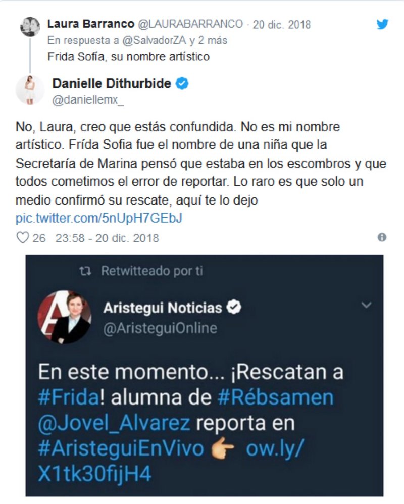 No, Laura, creo que estás confundida. No es mi nombre artístico. Frida Sofía fue el nombre de una niña que la Secretaría de Marina pensó que estaba en los escombros y que todos cometimos el error de reportar”.
