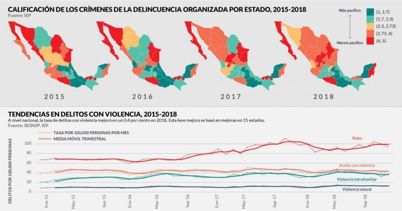 Asimismo, el Índice menciona que en el último año Baja California Sur tuvo el mayor grado de pacificación con un decremento de 76 por ciento de su tasa de homicidios, mientras que la entidad federativa con el mayor deterioro de su índice de paz fue Guanajuato, donde la tasa de homicidios tuvo un incremento de 127 por ciento.