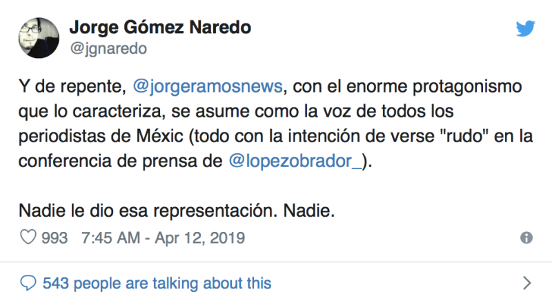 Tras el show montado por el periodista, las redes sociales se manifestaron en su contra; acusándolo, entre otras cosas, de haber sido enviado por el gobierno de Donald Trump para reventar la conferencia de prensa del presidente, y también de achacarle a este el problema de inseguridad heredado de los gobiernos de Enrique Peña Nieto y Felipe Calderón.