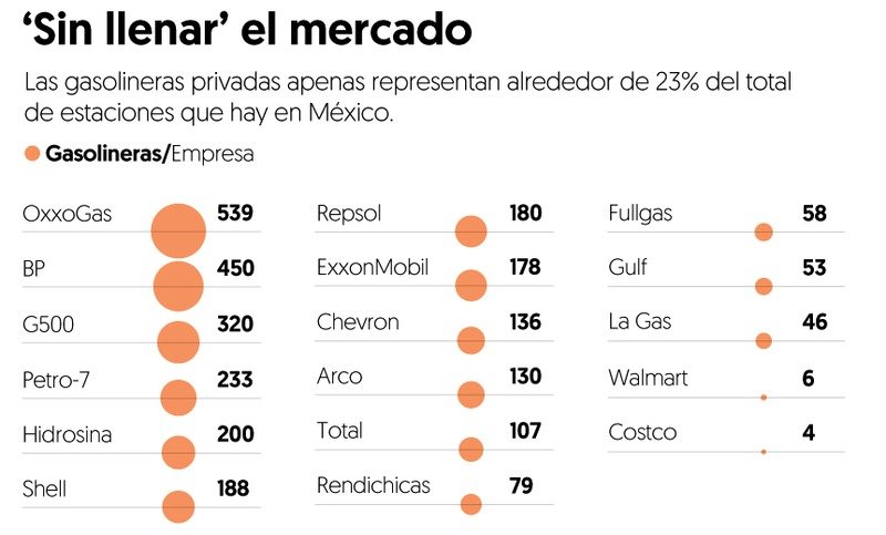En México hay alrededor de 12 mil 837 estaciones, sin embargo, apenas 2 mil 907 son de empresas privadas, es decir alrededor de 23 por ciento son gasolineras de firmas como Shell, Petro-7, Oxxo Gas, Chevron y Exxon Mobil.