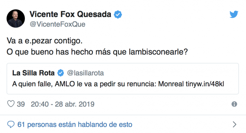 A través de su cuenta de Twitter, Fox Quesada retomó una declaración de legislador a La Silla Rota, en donde expresó que “quien falle, AMLO le va a pedir su renuncia”. En ese sentido el exmandatario destacó que es con Monreal con quien debería empezar la regla.