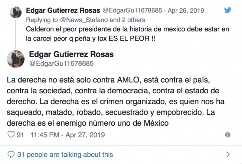 Ya todos sabemos que @FelipeCalderon aglutina y promueve trolls en redes sociales para legitimar el discurso de odio. Es gravísimo e irresponsable aglutinar a la gente más vil para empujar a su partido político #MéxicoLibre” [sic].