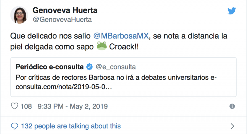 Sin embargo, en su mensaje Huerta señaló que lo que calificó como “piel delgada” del abanderado, se asemeja a la de un “sapo”, lo cual señalan usuarios de la plataforma, hizo en alusión al físico del exsenador, a quien internautas comparan con dicho animal.