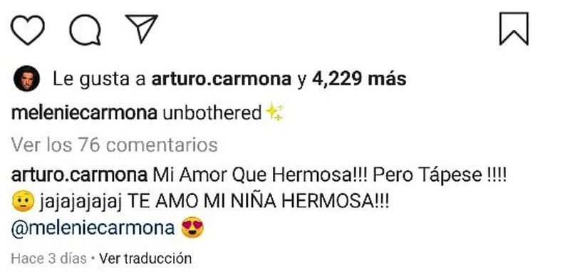 Arturo Carmona declaró que Melenie es el amor de su vida y le escribió un halago por lo hermosa que se ve, pero le pidió que se tapara un poco más. Esto fue lo que publicó el exfutbolista: ‘¡Mi amor qué hermosa! ¡Pero tápese! ¡Te amo mi niña hermosa!’.