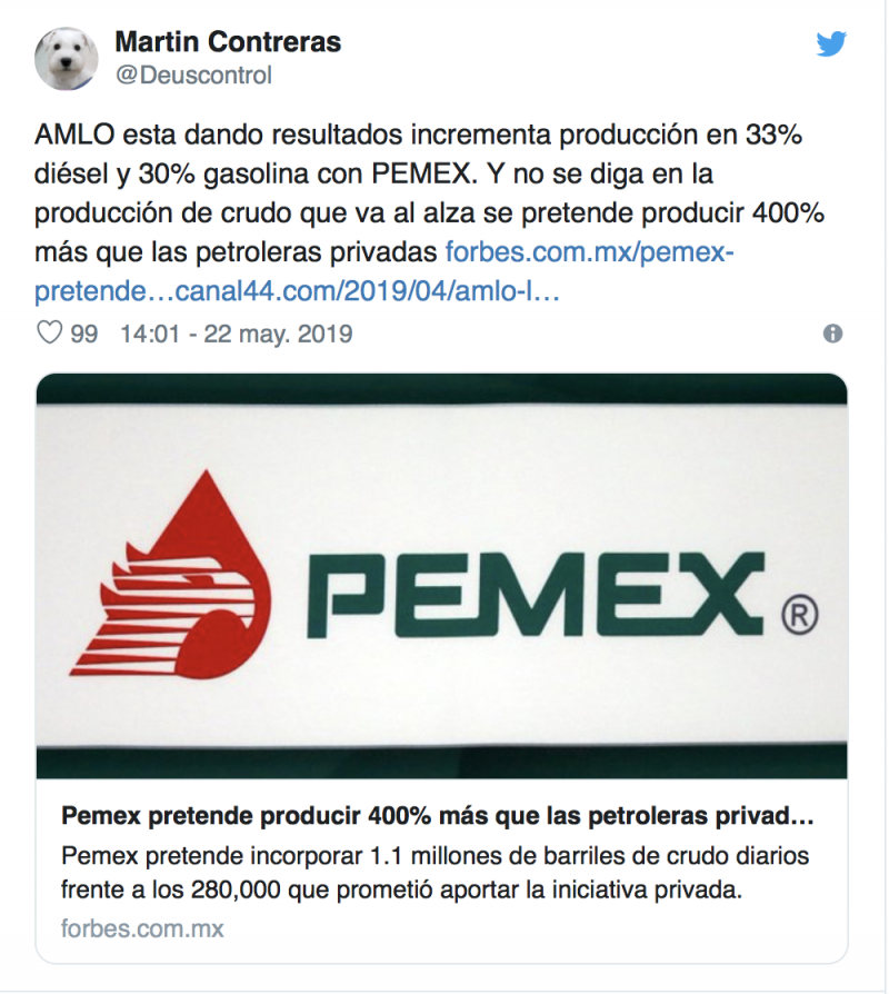 El mandatario considera prioritario devolver a Pemex su antigua productividad, por lo que el Gobierno Federal ha puesto en marcha diversas acciones como el envío del Ejército a perseguir a las bandas criminales que roban combustible de los ductos, así como la construcción de la refinería Dos Bocas, Tabasco.