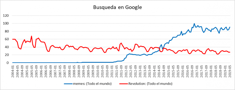 Un primer acercamiento a la comprobación de la hipótesis de que la postverdad y su punta de lanza los memes, están desviando la atención y eclipsando el interés hacia los movimientos sociales es la siguiente gráfica, donde se muestra un punto de cruce entre la búsqueda en Google a nivel mundial de los memes que van en ascenso y del concepto de revolution que va en descenso a nivel global.