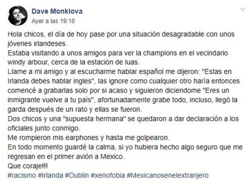 Sin embargo, es muy triste saber que no sólo es en tierras norteamericanas donde nuestros compatriotas a veces sufren este tipo de cosas. En esta ocasión lo decimos porque a través de redes sociales, un mexicano denunció la manera en la que tres adolescentes de Dublín, Irlanda, lo agredieron y acosaron cuando lo escucharon hablar español, y comenzaron a exigirle que regresara a su país.