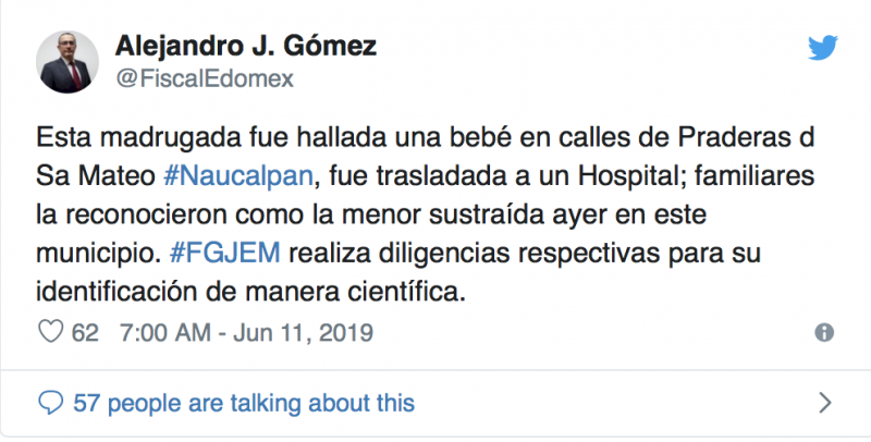 "La familia de la bebé reportada como no localizada fue notificada sobre el hallazgo y posteriormente se trasladaron al hospital donde reconocieron plenamente a la menor, sin embargo, se llevarán a cabo pruebas de genética para llevar a cabo la identificación de manera científica", aclaró la Fiscalía General de Justicia del Estado de México.