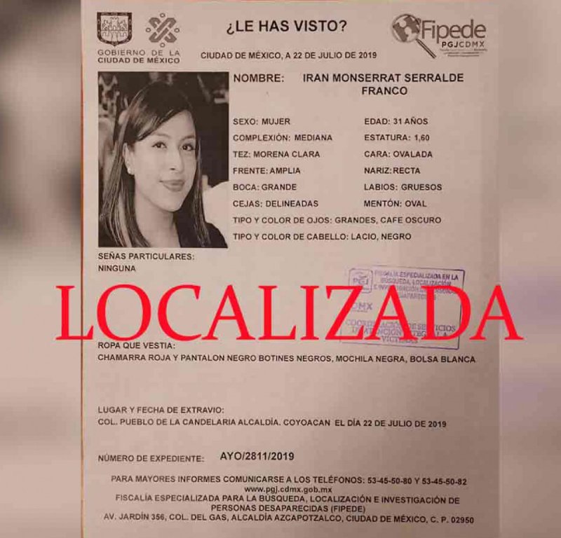 Iran Monserrat Serralde Franco de 31 años de edad ya fue localizada, informaron familiares y amigos a través de redes sociales. Ello, luego de que la joven fue reportada como desaparecida este lunes.