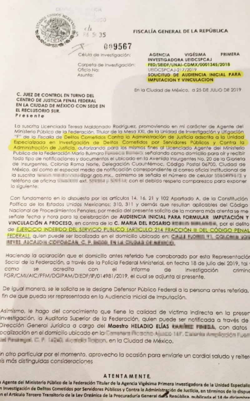 “Con fundamento en los dispuesto por los artículos 14, 16, 21 y 102 Apartado A, de la Constitución Política de los Estados Unidos mEXICANOS: 310, 311 y demás que resultan aplicables del Código Nacional de Procedimientos Penales; por medio del presente solicito de la manera más atenta se me señale la fecha y hora para la celebración de AUDIENCIA INICIAL PARA FORMULAR IMPUTACIÓN Y VINCULACIÓN A PROCESO, en contra de la C. MARIA DEL ROSARIO ROBLES BERLANGA, por el delito de EJERCICIO INDEBIDO DEL SERVICIO PÚBLICO (ARTÍCULO. 214 FRACCIÓN III DEL CÓDIGO PENAL FEDERAL), quien puede ser localizada en el domicilio ubicado en: