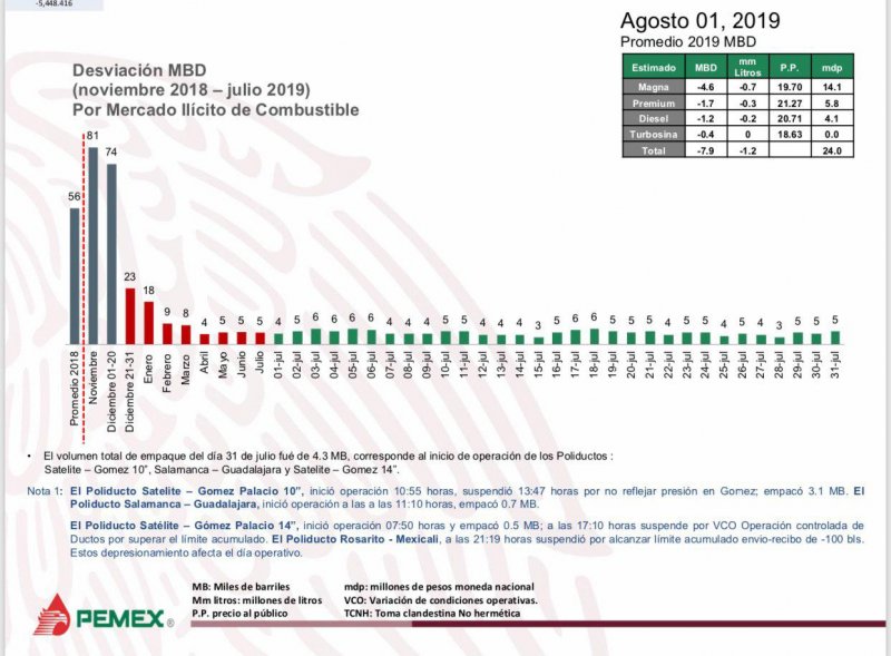 “Ayer fue esa cantidad de 40 pipas, antes se robaban 80 mil barriles diarios y tenemos un promedio de 4 mil barriles diarios”, acotó.