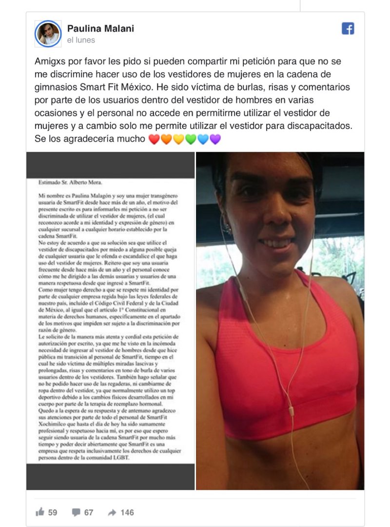 Fue a través de Facebook que Paulina expuso su caso y compartió una copia de la carta que dirigida a la empresa; en ella detalla que desde hace más de un año es usuaria de la sucursal y que todo había estado bien hasta que informó al personal sobre su transición y este resolvió que tendría que continuar utilizando los vestidores de hombres o, el destinado para personas con alguna discapacidad.