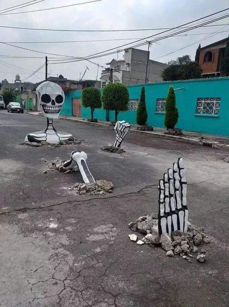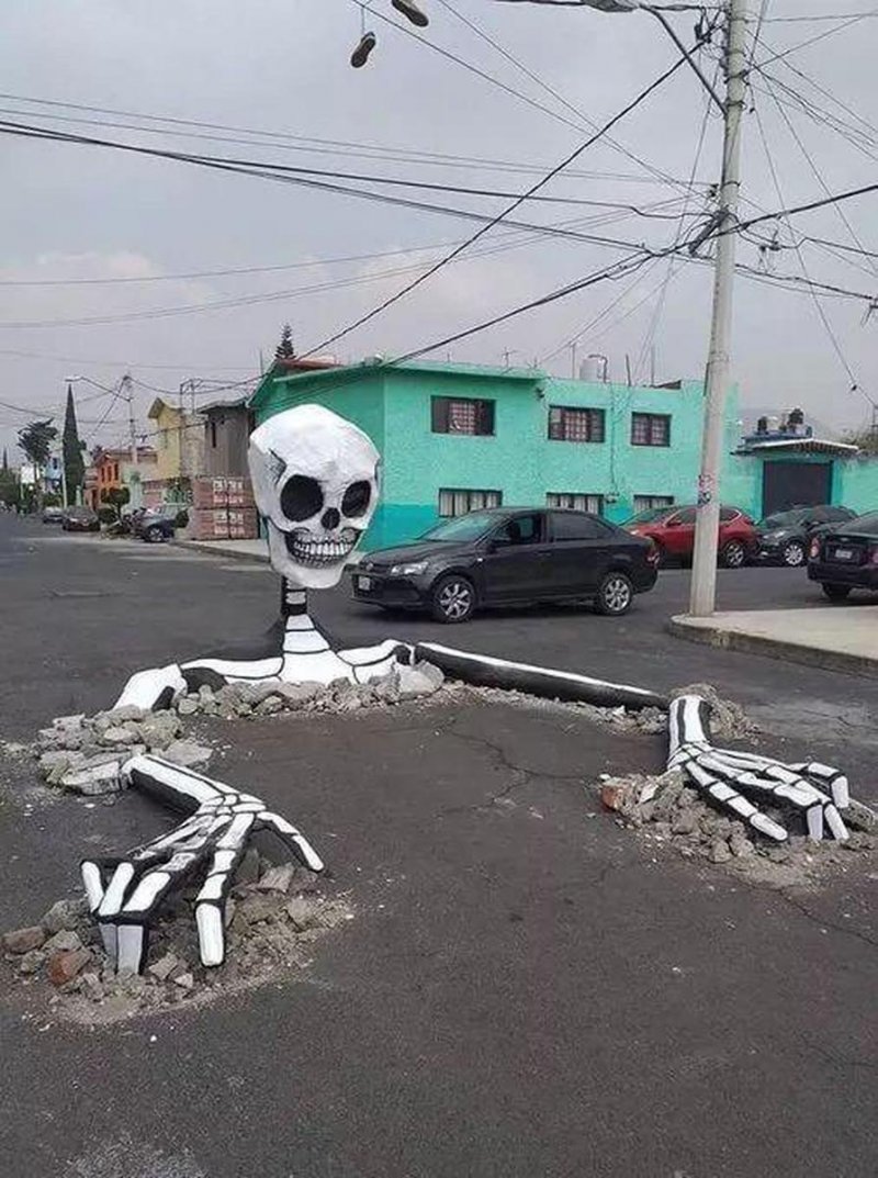 En la Alcaldía Tláhuac, los vecinos se pusieron creativos ante la falta de acciones de las autoridades, y decidieron ocupar la gran cantidad de baches para colocar una calavera.