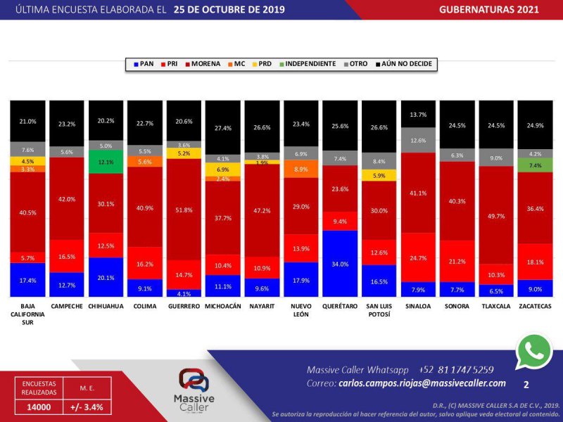 Aún y cuando buena parte de la oposición apostaba que el operativo fallido en Culiacán, Sinaloa, en el que fue liberado el hijo de Joaquín “El Chapo” Guzmán, Ovidio Guzmán López, iban a desgastar al presidente Andrés Manuel López Obrador y a su partido, el Movimiento de Regeneración Nacional (Morena) encabeza las preferencias en 13 de 14 de los estados en donde se desarrollarán elecciones en 2021, de acuerdo con la encuesta Massive Caller-La Razón, levantada el pasado 25 de octubre.